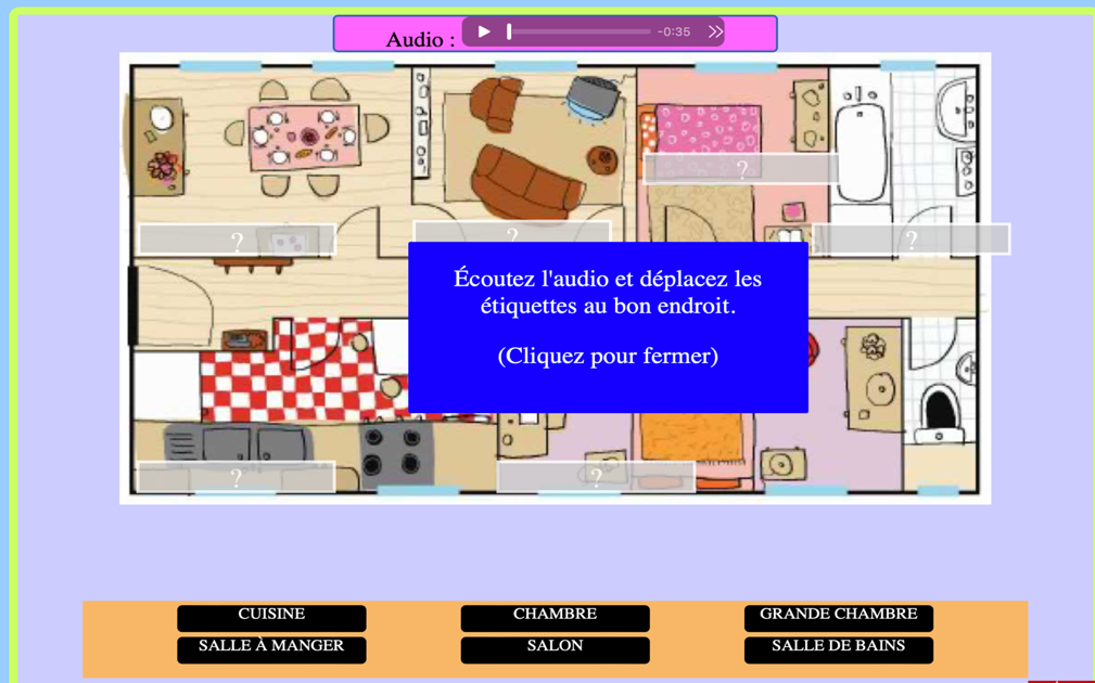En outre, la multimodalité induite par les TICE permet de dynamiser les apprentissages et la production orale, grâce à des supports pédagogiques variés. Nous utilisons ainsi régulièrement les logiciels de présentation, pour leur grande fonctionnalité et la possibilité d’y insérer des vidéos, des liens internet, des images, du son et du texte, en y incluant notamment des liens vers des learning apps en ligne, selon les thèmes abordés. Ces outils ont un intérêt certain dans l’autonomisation des apprentissages pour tous les niveaux, car ils permettent de travailler les compétences de manière différenciée, selon les objectifs du formateur : orales uniquement, ou orales et écrites. Pour illustrer notre propos, nous avons choisi un exemple d’utilisation des learning apps sur le thème du logement[15], avec lequel il est possible de travailler uniquement les compétences de l’oral, pour faire découvrir la prononciation des différents items lexicaux et la faire répéter, ou simplement de remettre en mémoire le lexique déjà abordé. À l’issue des 200 premières heures de formation, avec l’entrée dans l’écrit selon la répartition 80% écrit et 20% oral, il nous semble judicieux de reprendre les mêmes supports numériques, pour maintenant présenter les éléments transcrits et déplaçables correspondants aux items lexicaux écoutés, et inviter les apprenants à les placer sous l’image associée, après avoir écouté l’ensemble de la présentation sonore du document.