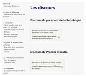 Quand la pandémie battait son plein, le gouvernement français (comme les autres gouvernements frappés) a introduit dans son site officiel le volet Informations Coronavirus avec l’objectif de communiquer aux citoyens les mesures nécessaires afin d’essayer d’aménager et contrer la crise. Par les articles publiés dans les onglets de cette section – Informations officielles, Comprendre la Covid-19, Ressources à partager, TousAntiCovid, Pass sanitaire, Déplacements, Vaccins, Questions/Réponses – le site porte à la connaissance des usagers non seulement les informations et les recommandations liées à la situation sanitaire et médicale, mais aussi les retombées (juridiques) de (la lutte contre) la diffusion du virus sur les citoyens eux-mêmes, ainsi que les consignes à respecter, les précautions à assumer, les mesures de protection, la vaccination, les règlements concernant les déplacements, etc. En effet, l’émergence sanitaire a provoqué un grand nombre de changements[6] nécessaires dans la vie quotidienne de tout le monde, qu’il fallait communiquer de manière correcte et par des voies officielles et fiables.