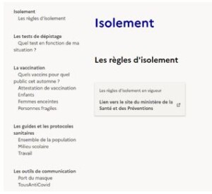 D’autres renvois hypertextuels conduisent au site du ministère de la Santé et des Préventions, pour retrouver les règles d’isolement en vigueur :