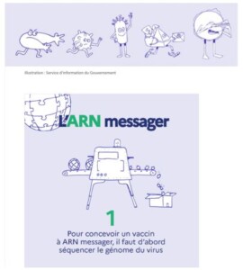Comme le montre la capture d’écran (Figure 7), en plus de la vidéo, le site propose des approfondissements en forme d’hyperliens cliquables à propos des vaccins à ARN messager, à adénovirus et à d’autres informations. En cliquant sur les boutons proposés, l’usager est conduit vers des hypertextes qui montrent des infographies, soit des explications scientifiques simplifiées et accompagnées d’illustrations (stratégie typique de la dimension scripto-visuelle de la vulgarisation scientifique et qui participe de la construction d’un discours multimodal efficace et captivant ; cf. JACOBI 1987). Le bouton « Le fonctionnement des vaccins à ARN messager » permet de découvrir 10 illustrations, dont nous ne rapportons que la première à titre d’exemple.
