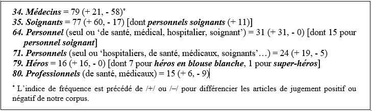Ci-dessous, selon le rang de fréquence, le relevé des termes – avec leurs concordances – aptes à désigner la catégorie des médecins d’après la liste des entrées fournie par le logiciel Concord :