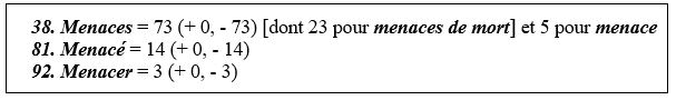 Il s’agit de « messages dont l’intensité s’avère scalaire, allant de l’offense à l’agression verbale la plus violente, celle qui incite à la mort » (MONNIER, SEOANE 2019 : 4). En témoigne la récurrence du substantif menace, présent aussi sous sa forme verbale :