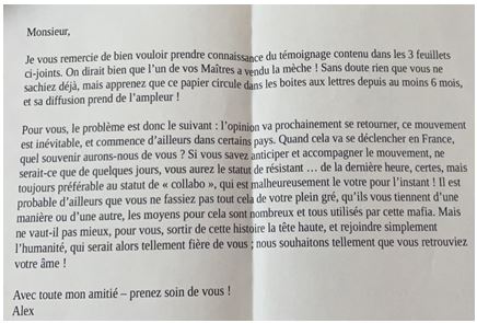 Pour étayer la charge argumentative de son attaque, il rapproche la société totalitaire dans laquelle on vivrait, où l’opinion commune est façonnée par le gouvernement, les organes de presse et des institutions comme l’Ordre des médecins, du gouvernement de Vichy. Un réseau d’axiologiques négatifs est déployé pour qualifier ceux qui sont en première ligne dans la lutte publique contre la désinformation scientifique, cités nommément dans le texte : ils sont en fait accusés d’être des pseudo-pourfendeurs de fake news, des propagateurs de contre-vérités, des « khmers blancs »[8] militants défendant une pensée dogmatique et rejetant tout doute constructif, de véritables terroristes intellectuels, coupables, entre autres, d’avoir sabordé le traitement curatif à base d’hydroxychloroquine proposé par le professeur Didier Raoult (microbiologiste et professeur des universités dont les prises de positions ont alimenté de nombreuses théories du complot), la seule lueur d’espoir pendant la diffusion du virus. Derrière ce qu’il considère comme une escroquerie, l’auteur anonyme voit des catégories bien précises qui tirent profit de ce crime, à savoir l’industrie pharmaceutique, les médecins corrompus, les politiques à l’idéologie européiste et mondialiste.