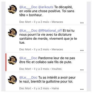 Parmi d’autres témoignages frappants de FTAs rapportés par la presse, celui de Franck Clarot, radiologue, qui a défendu une politique de lutte contre le coronavirus fondée sur les données scientifiques ; cela lui a valu, dès mars 2020, du flaming[4] et des menaces de mort envers lui et sa famille par quelqu’un qui a créé un compte sous le pseudonyme « Doc_Mort » :
