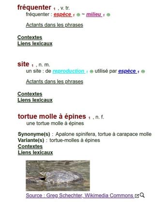 D’abord, la distinction entre unités prédicatives, unités non prédicatives et unités quasi-prédicatives est rendue explicite dans les articles de la manière suivante : les termes prédicatifs et quasi-prédicatifs sont accompagnés d’une structure argumentale ; les termes non prédicatifs (moins nombreux que le précédents) ne sont accompagnés que d’une indication de leur partie du discours. La figure 1 montre comment fréquenter (terme prédicatif), site (terme quasi-prédicatif) et tortue molle à épines (terme non prédicatif) sont décrits dans les premières parties des articles qui leur sont consacrés[5]. On remarquera également la différence de format des structures argumentales de fréquenter et de site. Les structures argumentales de termes quasi-prédicatifs lient les arguments au terme au moyen de périphrases.