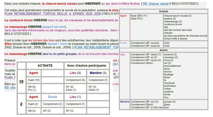 Les résultats de l’annotation sont présentés dans différents formats aux utilisateurs : 1. mise en évidence du terme, de ses arguments et des circonstants dans les contextes ; 2. tableau récapitulatif des rôles sémantiques, des groupes et des fonctions syntaxiques des arguments et circonstants ; 3. tableau de valence synthétisant les combinaisons possibles entre le terme et ses arguments et circonstants (la figure 2 montre ces trois formats pour le verbe hiberner).