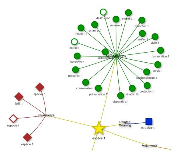 Nous illustrons notre propos au moyen des termes reliés à la thématique des espèces menacées qui sont décrits dans la ressource (qui répertorie également des termes associés à d’autres thématiques comme celles des changements climatiques, de l’électrification des transports, de l’agriculture durable, etc.). Cet article se focalise sur la version française du DiCoEnviro, mais la même démarche est appliquée à la description de termes appartenant à d’autres langues (anglais, espagnol, italien, portugais et chinois[3]). Chaque langue est abordée séparément et les liens d’équivalence sont établis lorsque les articles sont suffisamment développés.