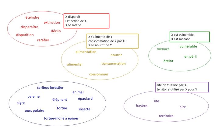 L’observation des contextes annotés permet de mettre en œuvre ces premiers critères. Ensuite, les terminologues établissent si les termes dénotent la même situation. Par exemple, la situation évoquée par les termes disparaître, disparition, éteindre et extinction se distingue d’une situation évoquée par vulnérable, en danger et en péril puisque les premiers termes impliquent une fin imminente, alors que les seconds évoquent un statut précaire, certes, mais sans fin assurée. De même, les termes disparaître, disparition, éteindre et extinction évoquent un changement d’état alors que d’autres termes comme abattage, abattre, décimer ou tuer engagent une cause ou un agent à l’origine de ce changement d’état.