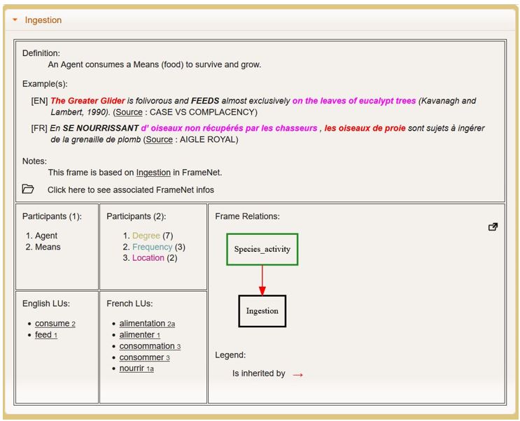 Les situations évoquées par les termes sont par la suite décrites dans une ressource complémentaire au DiCoEnviro, à savoir le Framed DiCoEnviro. Par exemple, la situation évoquée par les termes s’alimenter, alimentation, se nourrir, consommer et consommation est décrite dans un cadre sémantique appelé Ingestion (inspiré d’un cadre présent dans la ressource FrameNet) (figure 6). Dans le Framed DiCoEnviro, les termes appartenant aux différentes langues sur lesquelles nous travaillons sont également ajoutés. Les critères énumérés ci-dessus sont appliqués uniformément aux termes décrits dans les autres langues.