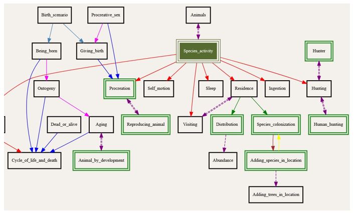 La figure 7 montre que la situation Ingestion est connectée à toute une série de situations décrivant les activités auxquelles se livrent les espèces menacées. Un cadre générique appelé Species_activities fédère des cadres décrivant des situations spécifiques : Ingestion (figure 6), mais également Residence (évoqué par les termes occuper et vivre), Self_motion (évoqué par les termes déplacement, déplacer, migration et migrer) ; Hunting (évoqué par les termes chasser, chasser et prédation), et ainsi de suite.